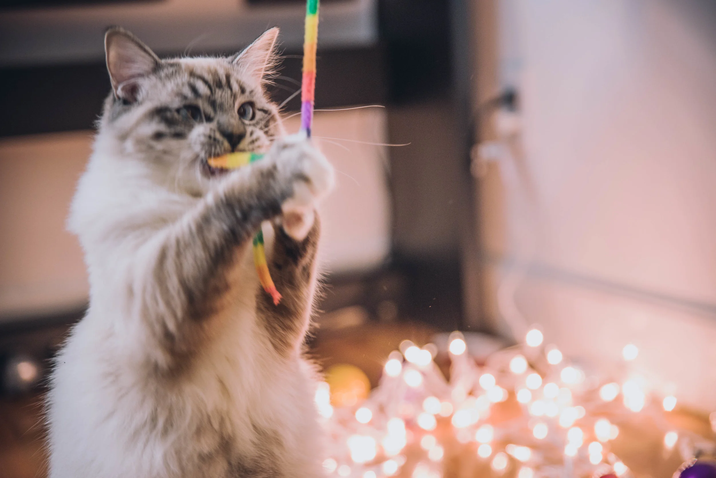 This was Christmas 2016. Luna can never resist playing the rainbow toy --- There came the cute shots!